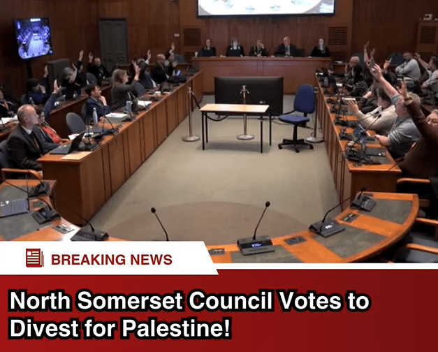 On 19 February 2025, North Somerset Council passed a motion calling on the Avon Pension Fund to to divest from companies “that facilitate Israel’s breaches of international law”, including arms companies supplying Israel and companies active in Israel’s illegal settlements.
