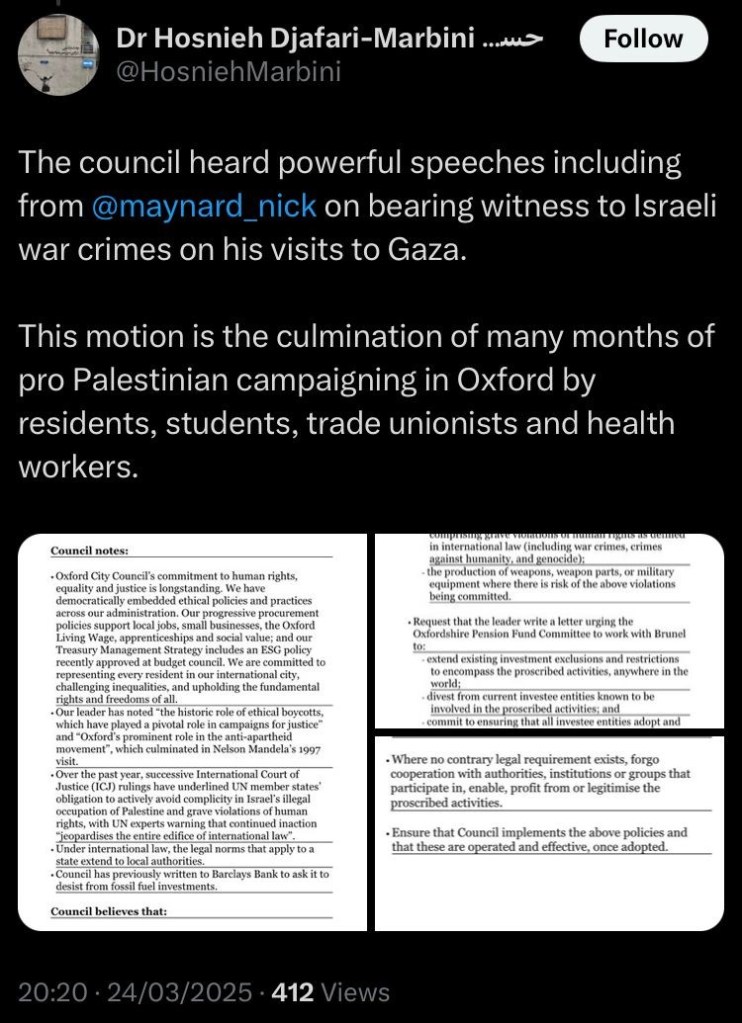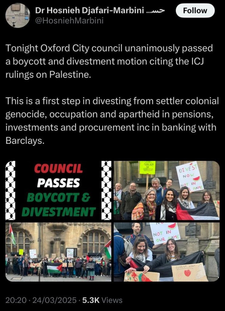 On 24 March, Oxford City Council passed a motion laying the ground to divest its pension fund and procurement from grave human rights violations, as well as the fossil fuel industry. The move follows months of campaigning for Palestinian rights by local residents, students, trade unionists and health workers.