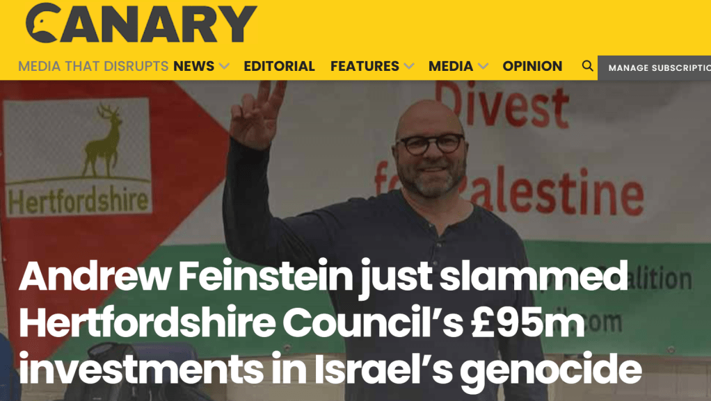 The national outlet the Canary ran with the headline “Andrew Feinstein just slammed Hertfordshire Council’s £95m investments in Israel’s genocide“. It noted that at the event, Feinstein “praised the Herts Palestine Support Coalition, which gathered signatures from audience members for its petition calling for Hertfordshire County Council to end its £95m investments in companies linked to grave human rights violations against Palestinians.”